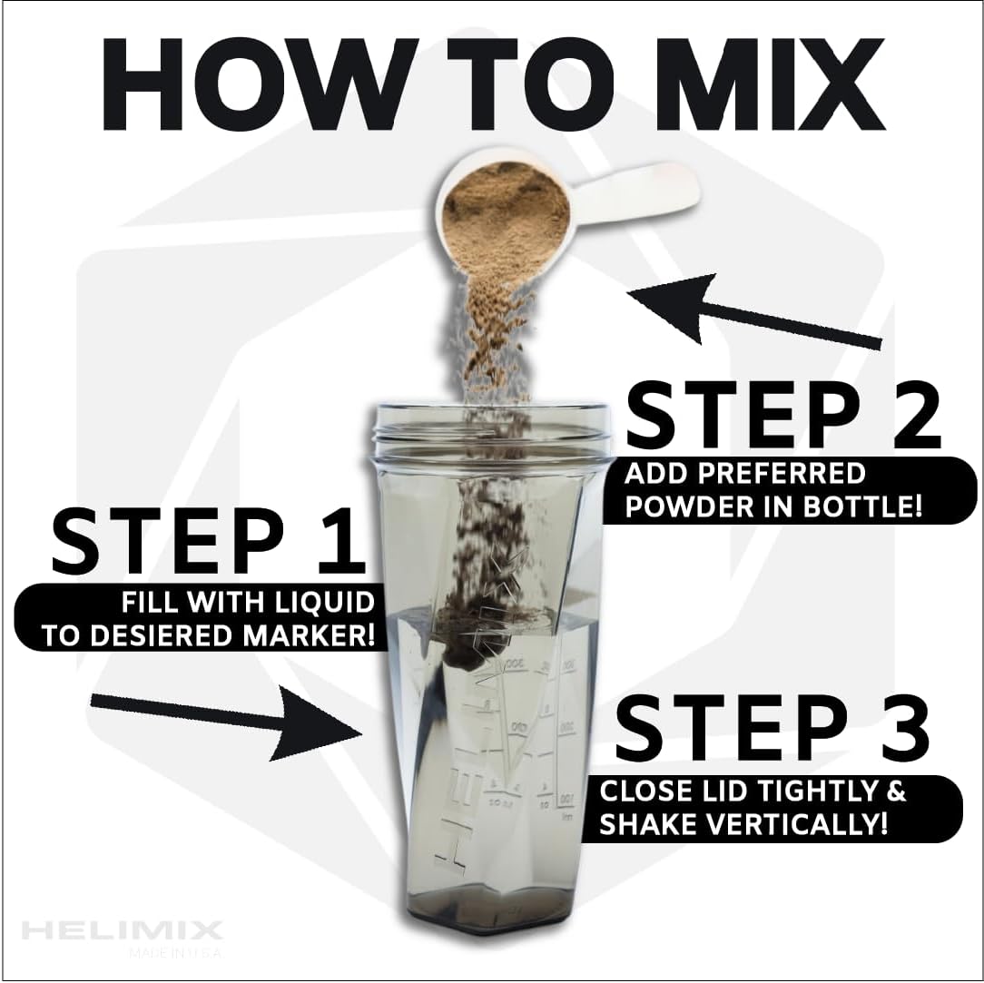 - Helimix Shaker Bottle: A gym essential for every workout. No need for a shaker ball or whisk, just shake and blend for a perfect protein shake. Great for pre workout, post workout and intra workout supplements.